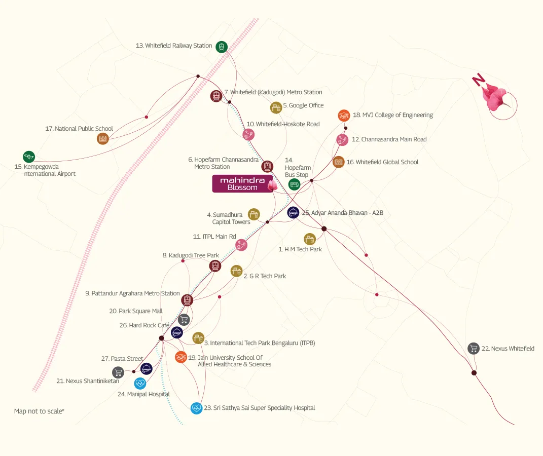 This Project is registered with Karnataka RERA having registration no. PRM/KA/RERA/1251/446/PR/171225/008348 dated 17-12-2025 valid upto 31-10-2030 available on http://rera.karnataka.gov.in/. The information contained herein is indicative of the kind of development that is proposed. The images and videos used are for representational purposes only. AI generated image for representation purposes only. Total Project area contains parks, open spaces, and civic amenities. Distances are indicative and approximate subject to road and infrastructure facilities as per Google Maps. The Map depicts only select landmarks and are not to scale. Plans & maps are not to scale. All specifications of the Project will be as per the agreement to be executed between the parties. Buyer Discretion advised. For more information, please contact our sales office/team at Mahindra Blossom, Pattandur Agrahara Village, K R Puram 3 Hobli, Bangalore East Taluk, Bangalore or visit www.mahindralifespaces.com.